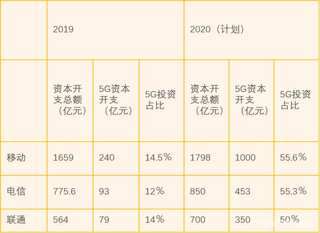 根据计划,三大运营商5G资本开支将大幅提高,投资占比将由2019年的14%左右提升至2020年的50%以上。需要注意的是,运营商们的计划资本开支总额并没有大幅提高,所以5G投资的大幅增加意味着4G投资的减少。