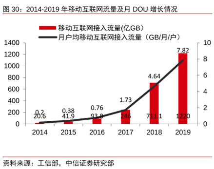 工信部最新数据显示,8月户均移动互联网接入流量达到11.25GB/户,同比增长30.3%。1-8月,移动互联网累计流量达1039亿GB,同比增长33.7%。从2014-2019年的月DOU增长情况也可以看出用户流量需求暴涨的趋势。