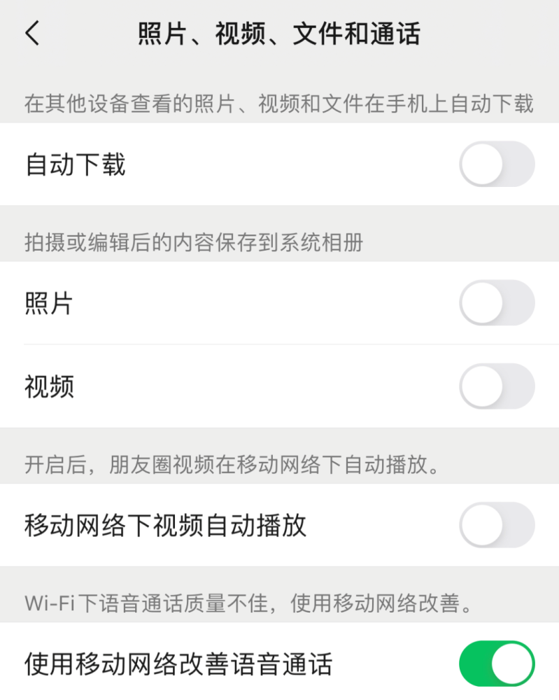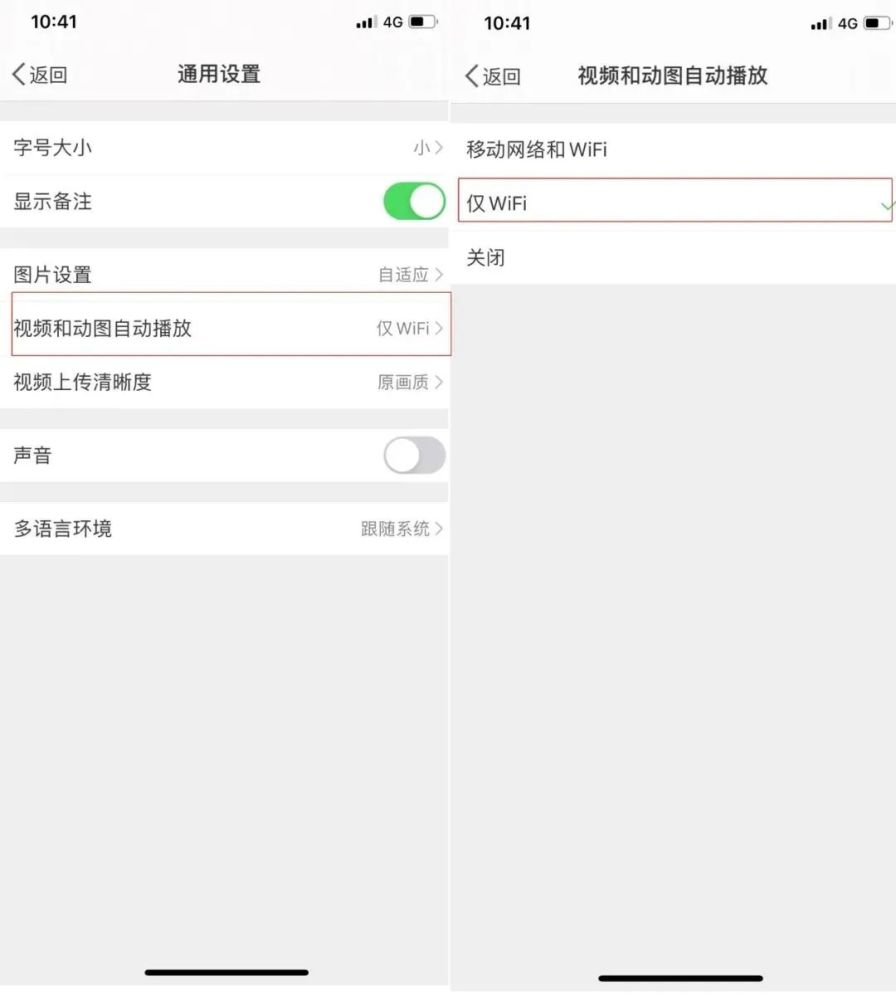 关闭“自动下载”和“移动网络下视频自动播放”,这样朋友圈视频就只会在WiFi下播放了。
