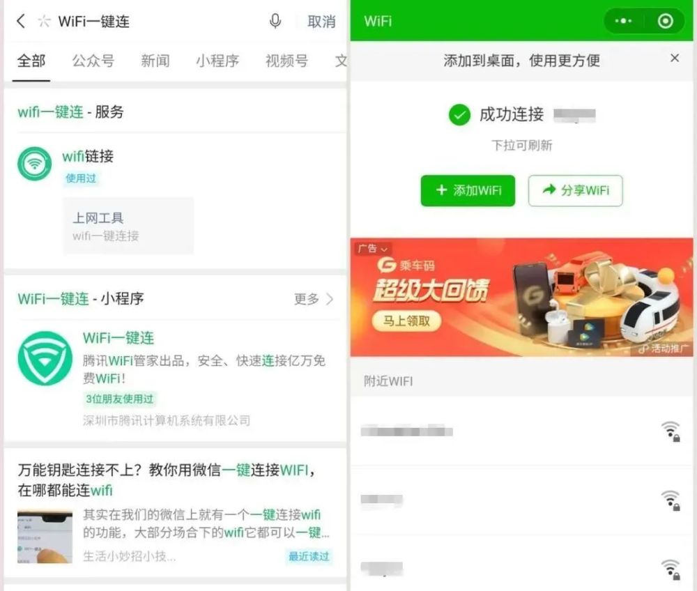 另外,如果手机上装了WiFi万能钥匙,自己家的WiFi也可能会被APP给共享出去,隐私性和安全性都不如小程序。