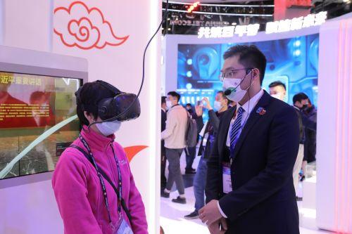 其中,在5G+智慧医疗、5G+智慧教育和5G+新商业三个板块,参观者还可进行丰富的互动体验。智慧医疗的VR脑健康一体机,参观者通过配套设备,可以测试和训练,训练过程通过5G+VR情境实现。智慧教育的未来课堂,参观者戴上VR眼镜,就如同置身真实的课堂。新商业的XR数字孪生平台,让参观者不仅可以在家就能逛“真”商场,还能探宝玩游戏,和明星真人互动。