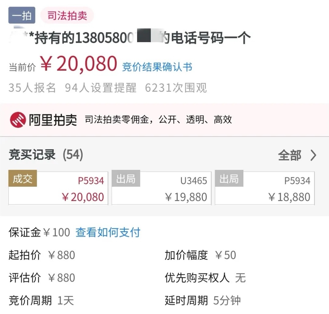 日前,该手机号码以880元为起拍价,在淘宝司法拍卖平台上架,35人参与竞拍,手机号码最终以2万余元成交,买受人按期支付了全部拍卖款项。