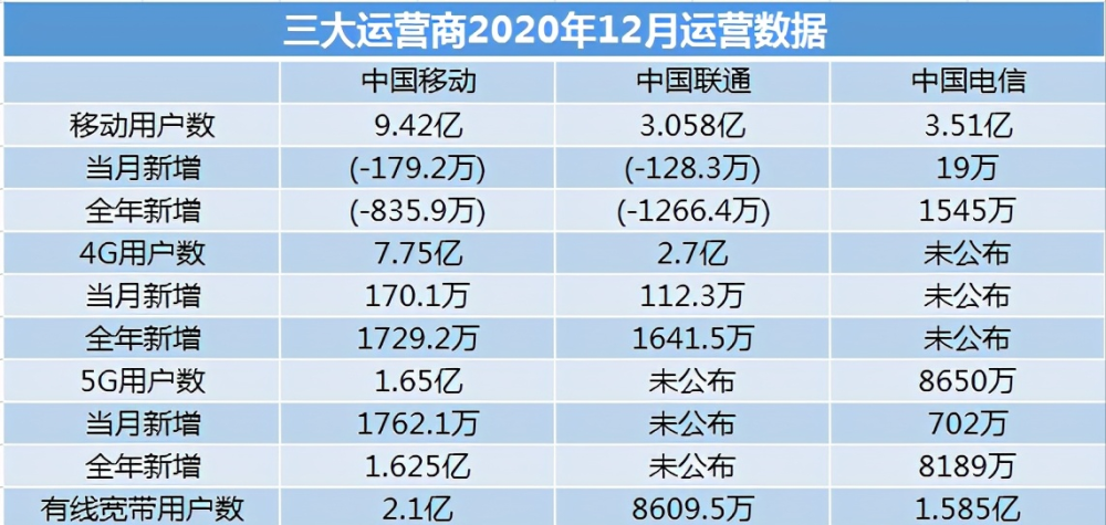数据显示,中国移动在2020年用户量不增反减,流失了835.9万用户,中国联通的用户量也减少了1266万人,只有中国电信用户量增加了1545万人次。