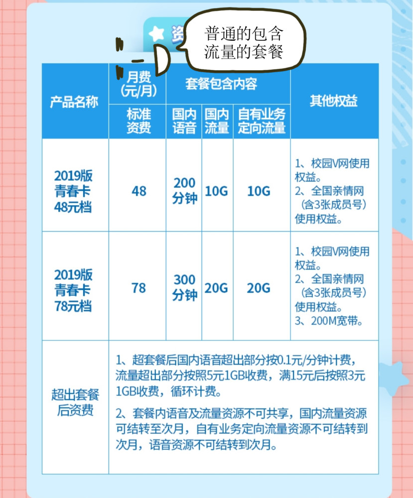 套餐内的流量是很便宜的,比套餐外的流量加油包要便宜很多,所以我们尽量去选择那些流量很多的套餐。就目前而言,纯流量卡套餐的流量最便宜,但是它只能用于上网,不能用于打电话和发短信,可以用作副卡使用,主卡只用于打电话和发短信。其次是有免流软件的套餐收费比较便宜了,因为这种套餐往往包含了几十个GB的免费的定向专属流量。最后是普通的包含流量的套餐收费相对于前两种而言,就贵了许多,我们也就不推荐大家办理了。