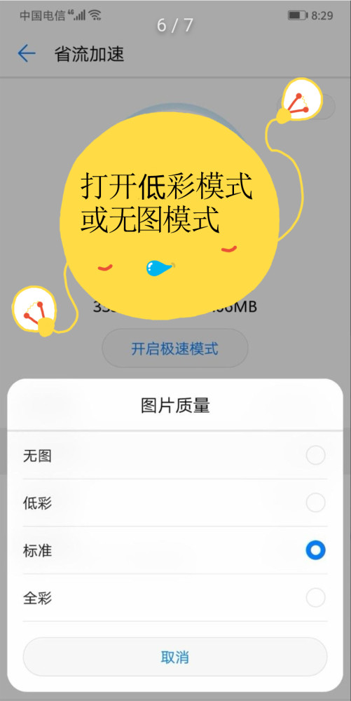 在数据传输的过程中,文字所占据的流量是很少的,大多数都是被图片、视频这种体积大的文件消耗了。降低他们的画质可以帮我们节约很多流量,牺牲一小部分的体验感,节约下一笔不少的流量费。