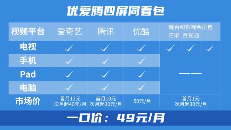 好在,现在开通北京移动互联网电视爱家影视会员 (以下简称“优爱腾四屏同看包”),爱奇艺、腾讯、优酷四屏(电视、手机、pad、电脑)会员全到手,另外还能享芒果、百视通、未来电视等大屏权益,连续包月仅需49元/月,简直不要太划算!